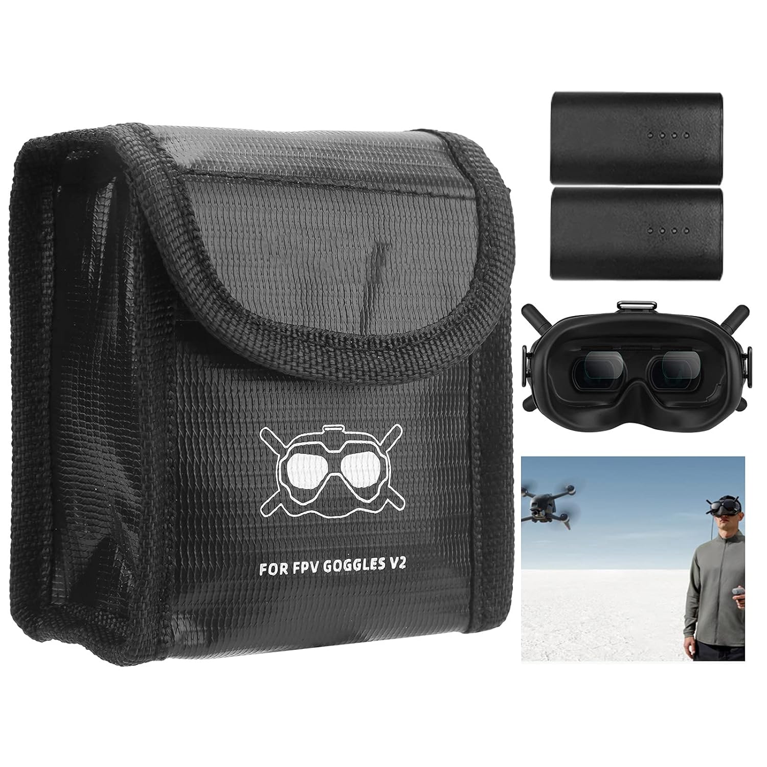 Heat-resistant LiPo transport bag to store or transport DJI FPV Goggles V2 and a battery.