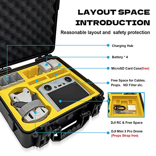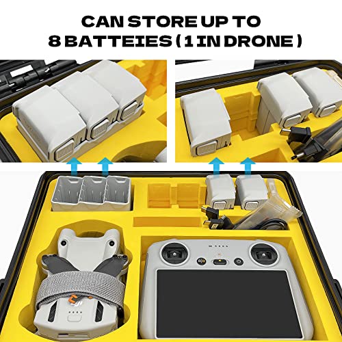 - 【Custom Design】This DJI Mini 3 Pro hard case specifically designed for DJI Mini 3 Pro. It can accommodate: 1x DJI Mini 3 Pro Drone,1x DJI RC, Up to 8 x Batteries [one piece on the drone ],1x Two-way Charging Hub and other cables spare propellers etc.