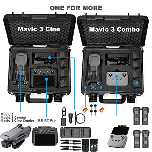 - 【Storage Capacity】1x DJI Mavic 3 Cine Drone or DJI Mavic 3 Fly More Combo, 5x DJI Mavic 3 Battery (Include Drone Inner Battery), 1x DJI RC Pro Remote Controller or DJI RC-N1 Remote Controller,1x DJI Mavic 3 Charging Hub, 1x DJI 65W Charger, 2x microSD Card, 2x Control Sticks (Pair), 4x Mavic 3 Propellers (Pair), Mavic 3 ND Filters Set, Cables and More Mavic 3 Accessories.